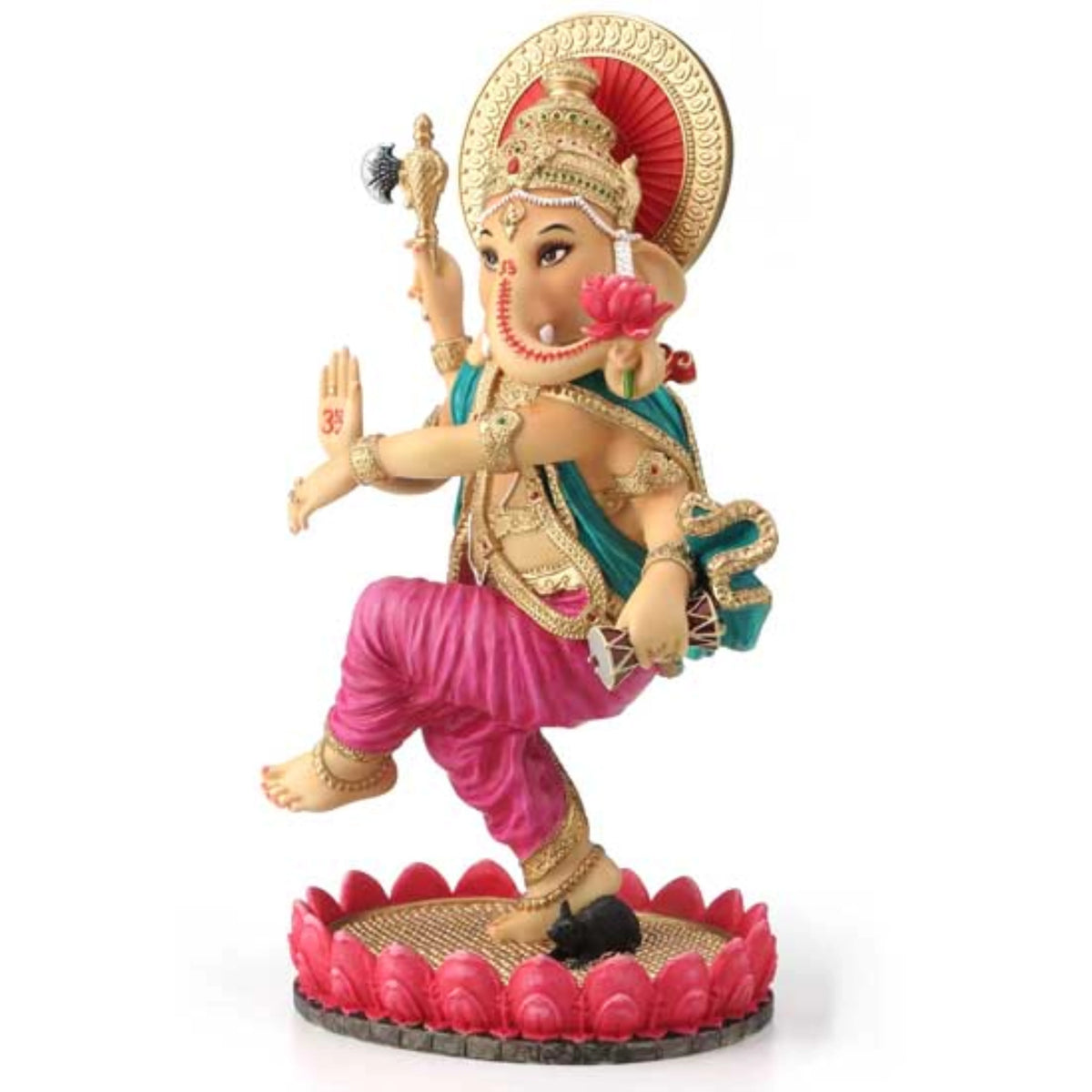 Add color, culture, and spiritual charm to your space with this exquisite Hand Painted Dancing Ganesha Figurine from Song of India. Meticulously crafted in durable resin and adorned in traditional tones of pink, green, and gold, this statue captures Lord Ganesha in a joyful dance atop his symbolic companion—the mouse. Every detail is thoughtfully hand-painted—from the intricate jewelry and divine halo to the vibrant lotus base and expressive posture. The dancing form of Lord Ganesha, revered as the Remover of Obstacles and God of Wisdom, represents grace, celebration, and creative energy. His presence is believed to bring wealth, happiness, and good fortune to any home.