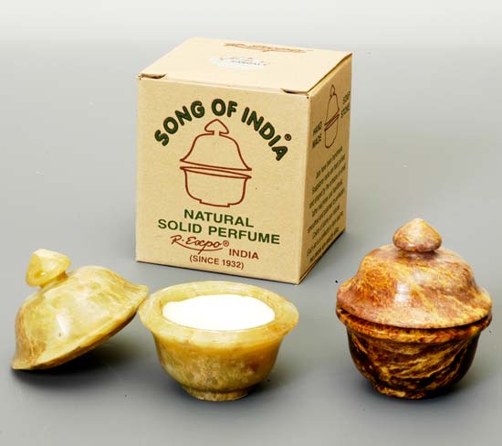 Natural solid perfume in a smooth stone jar.