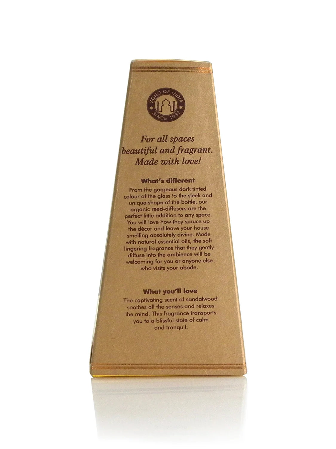 Elevate your space with the serene and soothing aroma of Mysore Chandan. Presented in a beautifully crafted amber-coloured glass jar with a sleek, unique shape and adorned with a delicate metal coin, this reed diffuser is both a stylish decor accent and a source of calming fragrance. Infused with natural essential oils and organic sugar cane alcohol, this 100ml diffuser gently disperses the warm, woody scent of sandalwood. The captivating fragrance relaxes the mind and soothes the senses, transporting you to a blissful state of calm and tranquility.