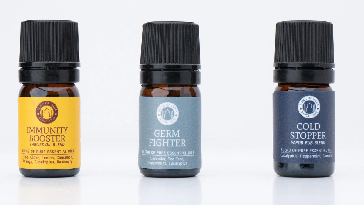 The Wellness Aromatherapy Gift Set features three 100% pure essential oils—Immunity Booster, Germ Fighter, and Cold Stopper.