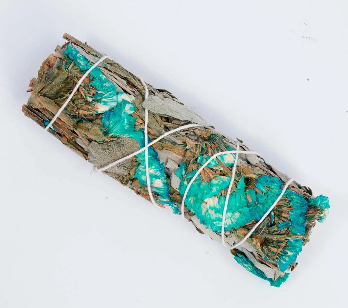 This bundle of White Sage, adorned with a turquoise-colored flower, is a powerful tool traditionally used for healing, purification, and spiritual cleansing. White sage has been revered for centuries by indigenous cultures for its ability to clear negative energy and restore balance to people, objects, and spaces. When burned, the fragrant smoke is believed to bless, cleanse, and heal, making it an essential component in many ceremonies and rituals. Its compact size makes this bundle perfect for personal use, travel, or quick smudging sessions. Whether you are new to smudging or a seasoned practitioner, this Botanical California White Sage Mini offers an easy and meaningful way to invite positive energy and healing into your life.